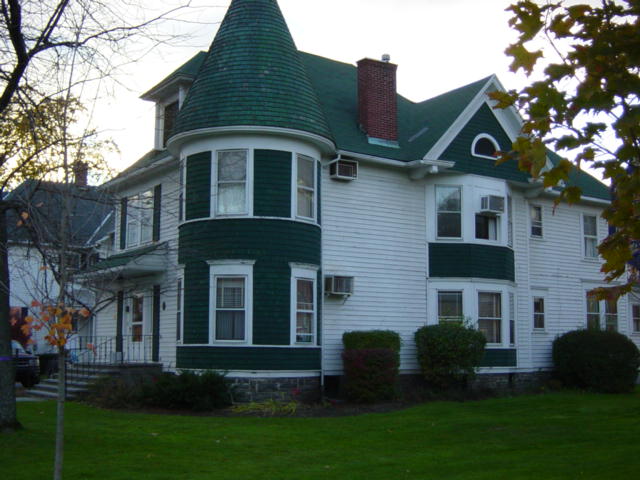 by the local builder Abram D. Brown, a prominent contractor who also built the Second Pike County Courthouse. The courthouse is next door and is as of 2011 for sale. This was the longtime home of Dr. W.B. Kenworthey, a Philadelphia who graduated from the University of Pennsylvania Medical School in 1895 and, after spending three years in nearby Dingmans Ferry, came to Milford to practice. This building is a 2-1/2 story Queen Anne-style residential building of wood-frame construction, with shingled corner tower on the right side capped with an entrance on the left side of the facade. Windows are flat-topped, with simple surrounds and a semi-circular lunette in the pediment. This building is listed in the National Register of Historic Places. In the rear, 410 Broad Street NE at the intersection of Peach and Gooseberry Alleys, is a 1-1/2 story wood-frame domestic automobile garage building with stuccoed exterior finish and gable roof, built in 1920. The house is located at 410 Broad Street, Milford, PA 18337<>Sources: