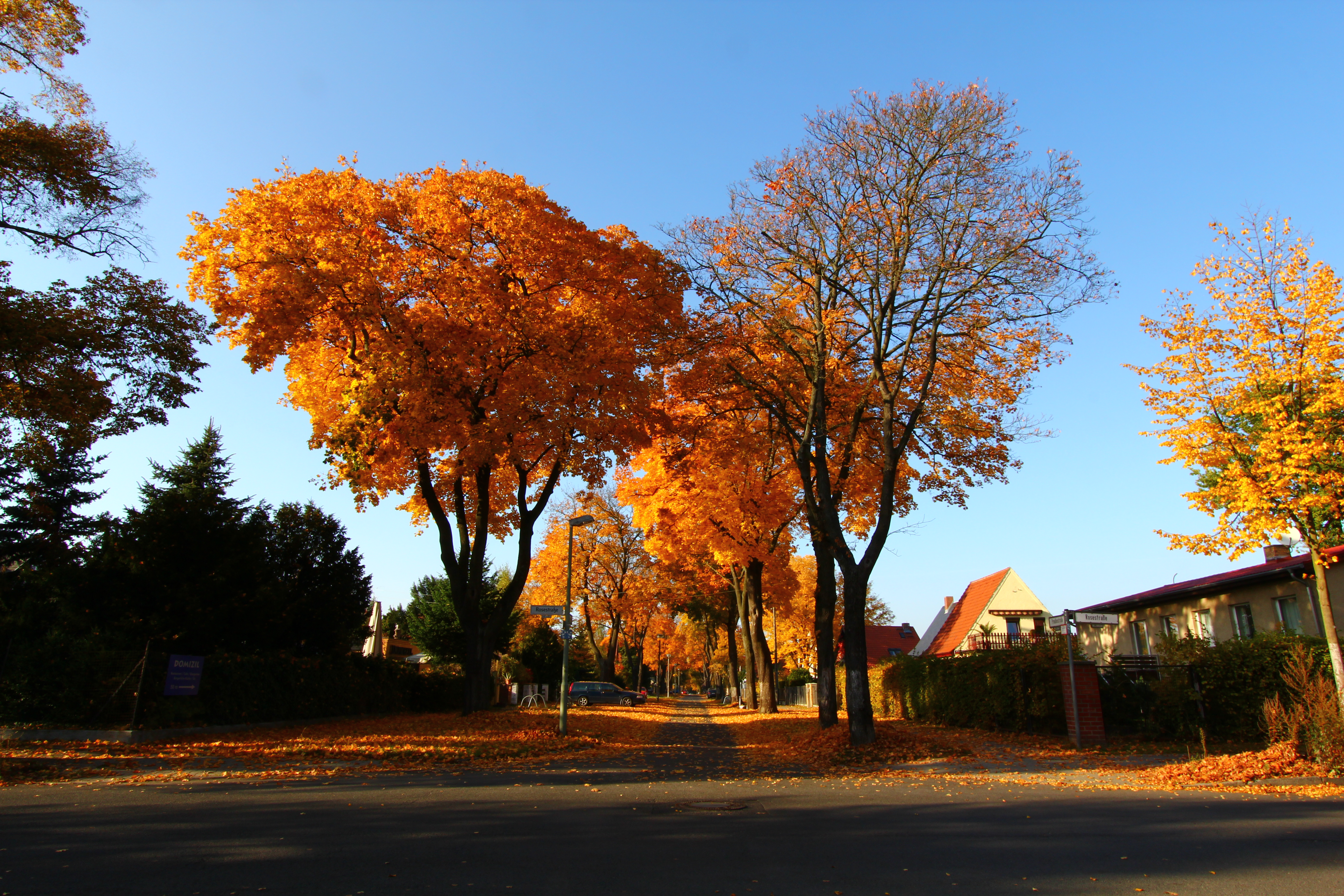 | Taken at 3:30 PM, the sun set around 2 hours later. Note the really long shadows. | The sun had set about three quarers of an hour before, but the sky was still bright, and I had waited for the streetlights ot go on. Yellow on yellow. Sometimes I have the feeling hat one cannot see so well with this yellow light, but I cannot see well by any light. |